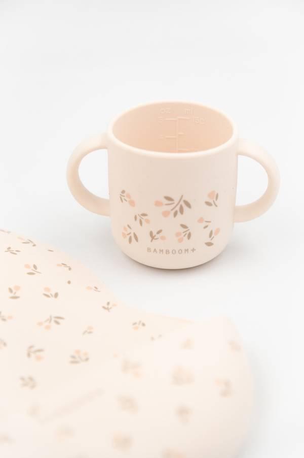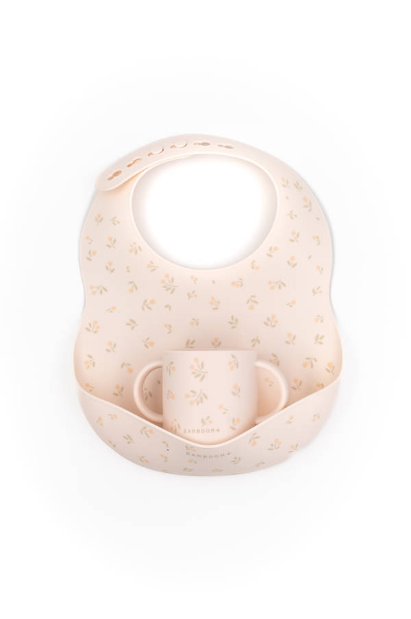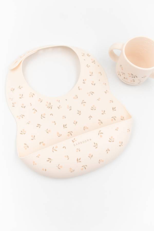 Il bavaglino e la tazza in silicone Bamboom uniscono funzionalità, comfort e stile, rendendo ogni pasto un momento di gioia e stile