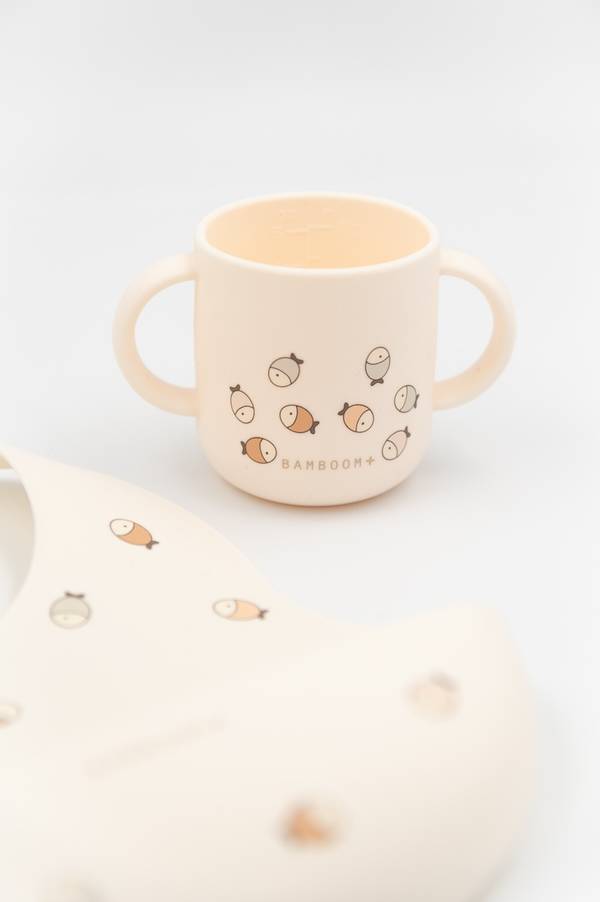 Il bavaglino e la tazza in silicone Bamboom uniscono funzionalità, comfort e stile, rendendo ogni pasto un momento di gioia e stile