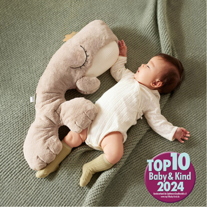 È un peluche intelligente e un un compagno affidabile: proprio come le vere balene si prendono amorevolmente cura dei loro piccoli, conforta e culla il bambino, garantendo notti tranquille anche ai genitori.