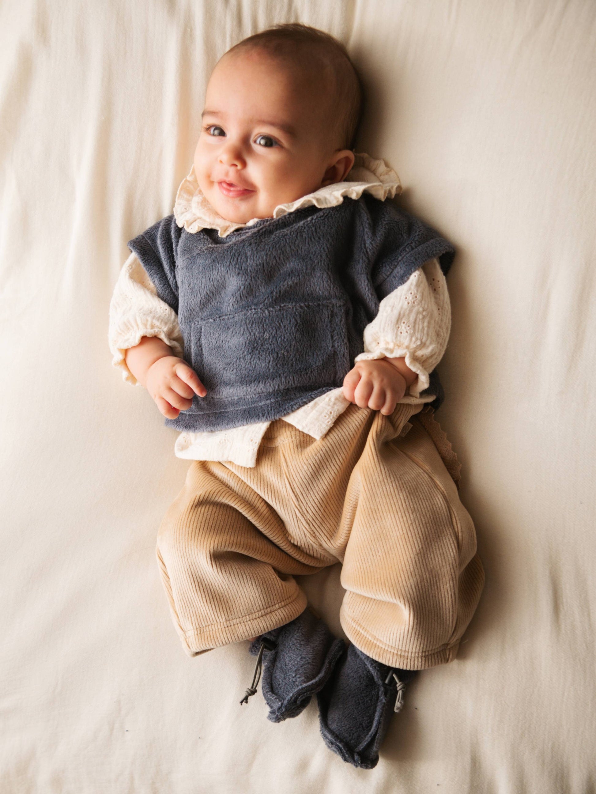 Disponibili in tre tonalità delicate — Midnight Blu, Vintage Pink e Mocha Sand — si abbinano con facilità a camicie, body o felpe della collezione. Il velluto a costine, oltre a essere morbido al tatto, è realizzato in tessuto di origine naturale, ideale per rispettare la pelle delicata dei bambini.