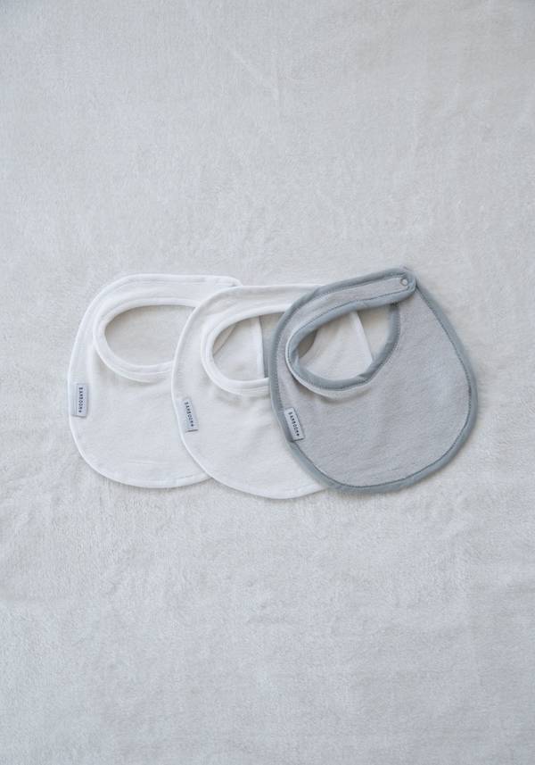 Il Bib Set è una confezione di tre bavaglini rotondi con perfetta copertura intorno al collo del bambino.