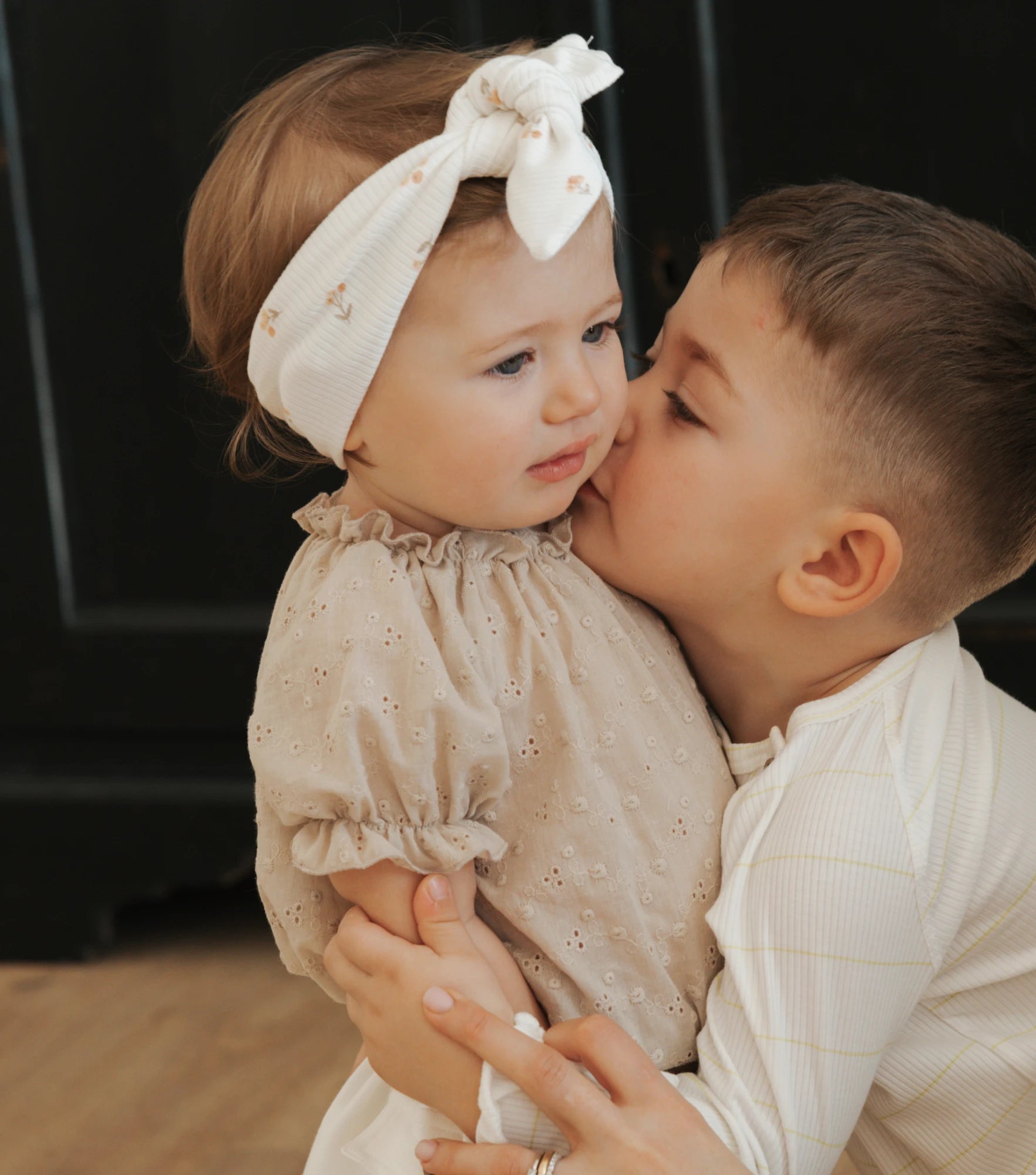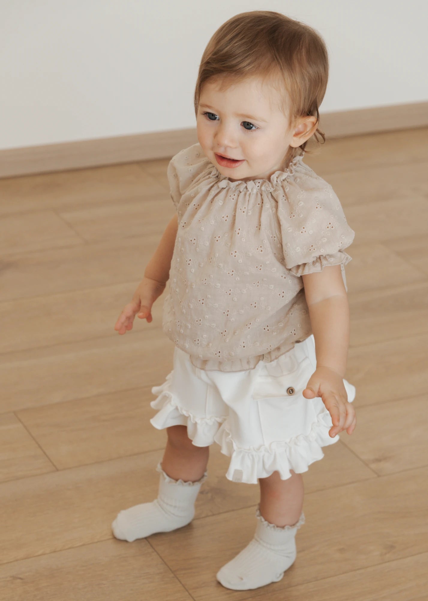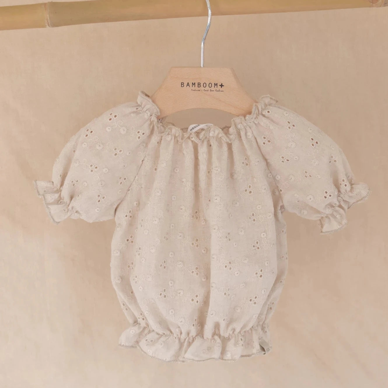 La camicia a maniche corte in sangallo Bamboom è una celebrazione di delicatezza e stile sostenibile per le più piccole. Realizzata con amore utilizzando fibre di bambù, questa maglietta unisce la morbidezza e la traspirabilità del materiale naturale con l'eleganza senza tempo del pizzo sangallo.