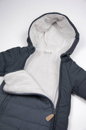 Il sistema di doppie cerniere rende la tuta estremamente facile da indossare e togliere, anche con il bambino in braccio. I risvolti su mani e piedi mantengono il calore all’interno, offrendo un ulteriore strato protettivo nei punti più esposti.