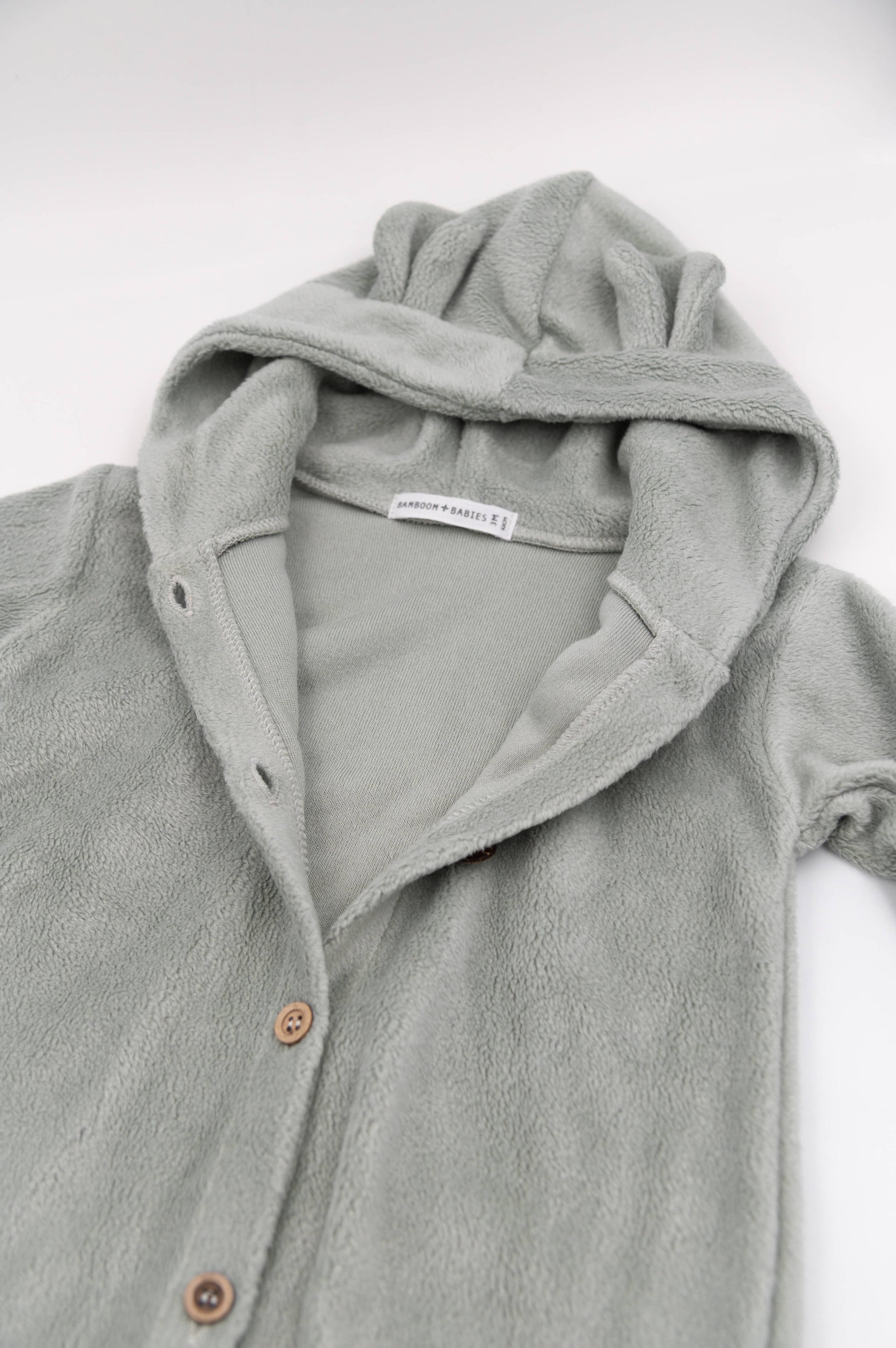 Il cappuccio con orecchie applicate regala un tocco adorabile, mentre la chiusura frontale con bottoni a pressione facilita la vestizione e il cambio. Disponibile in tenerissime tonalità neutre e polverose, è un capo ideale per i primi mesi di vita.