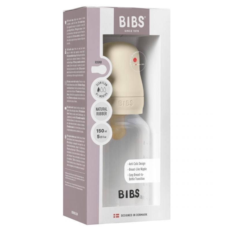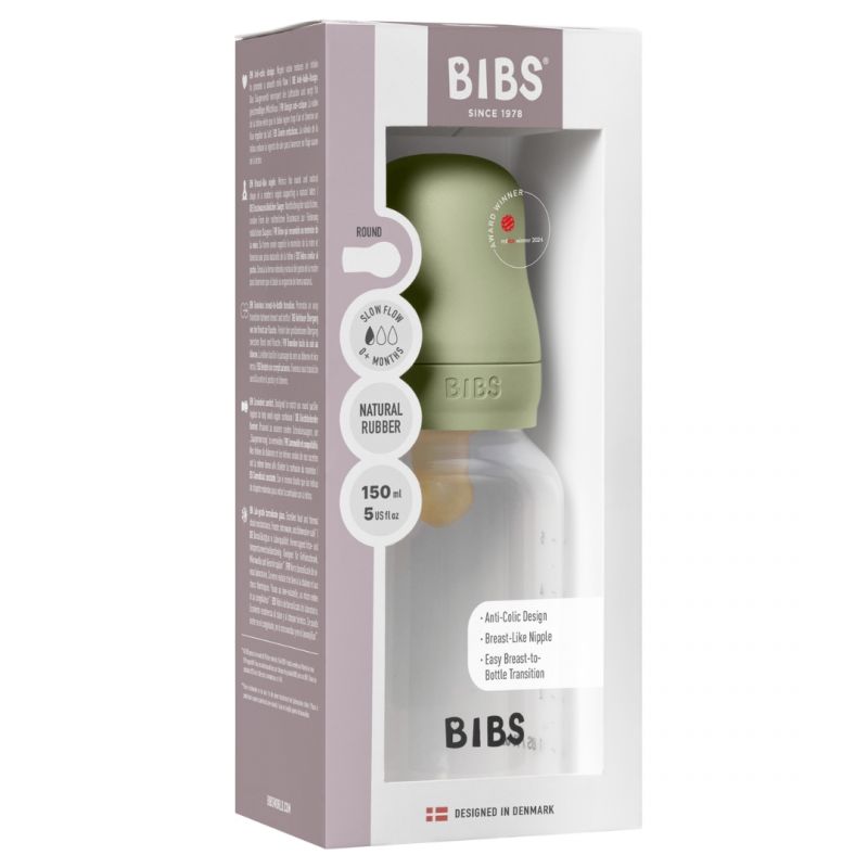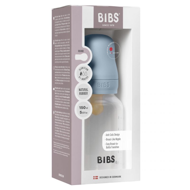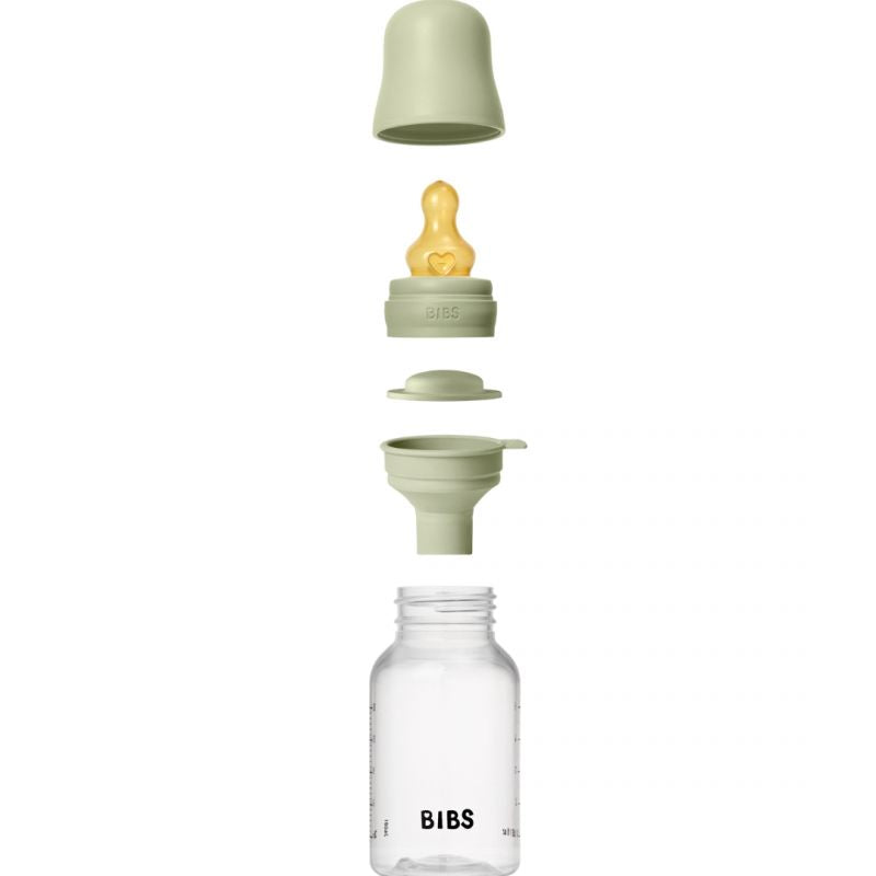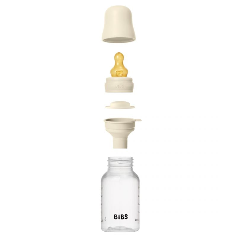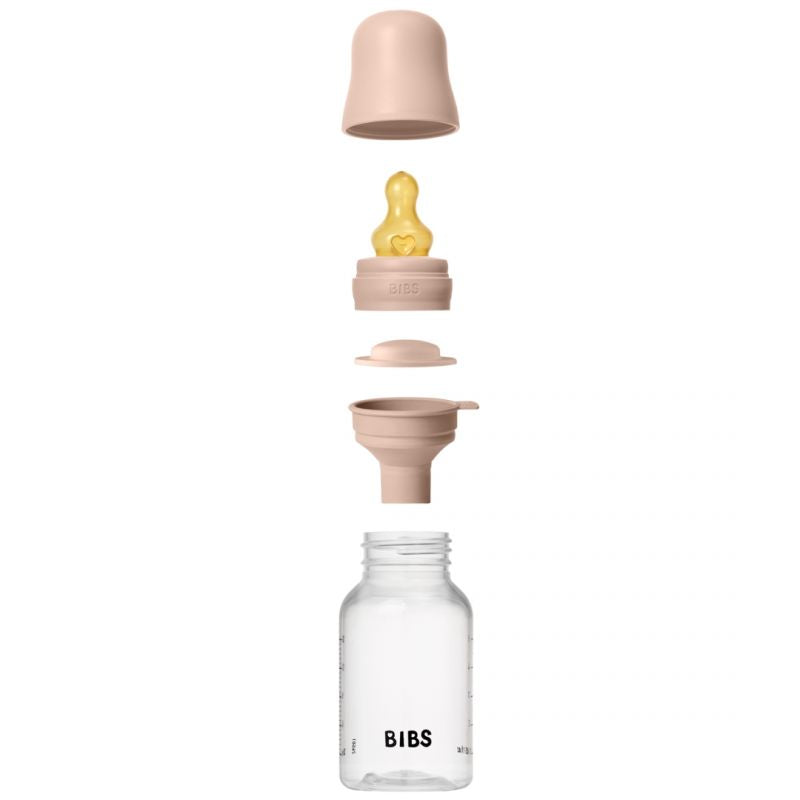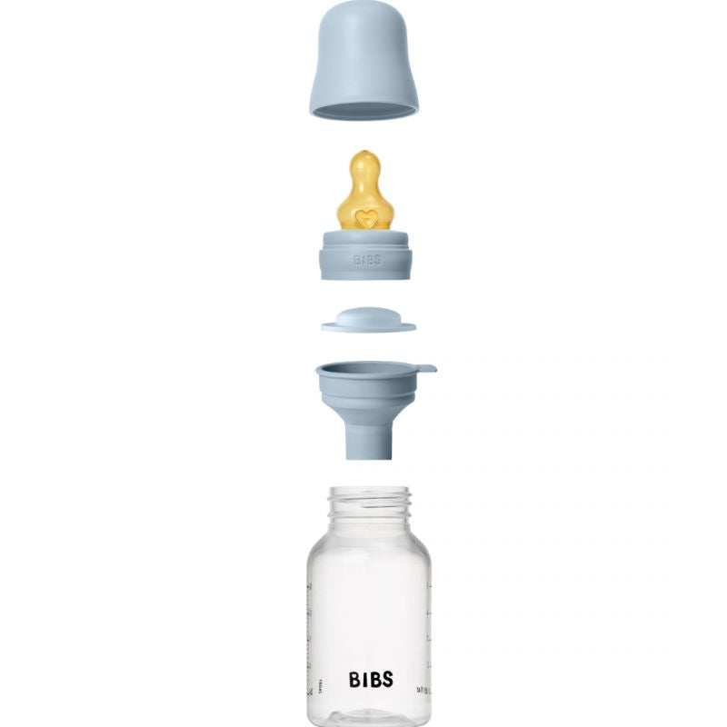 Il Set Completo Biberon include: una bottiglia in plastica BPA-Free 150 ml, il tappo, la tettarella flusso lento, il blocco per il latte, un tappo a vite e un imbuto pieghevole.