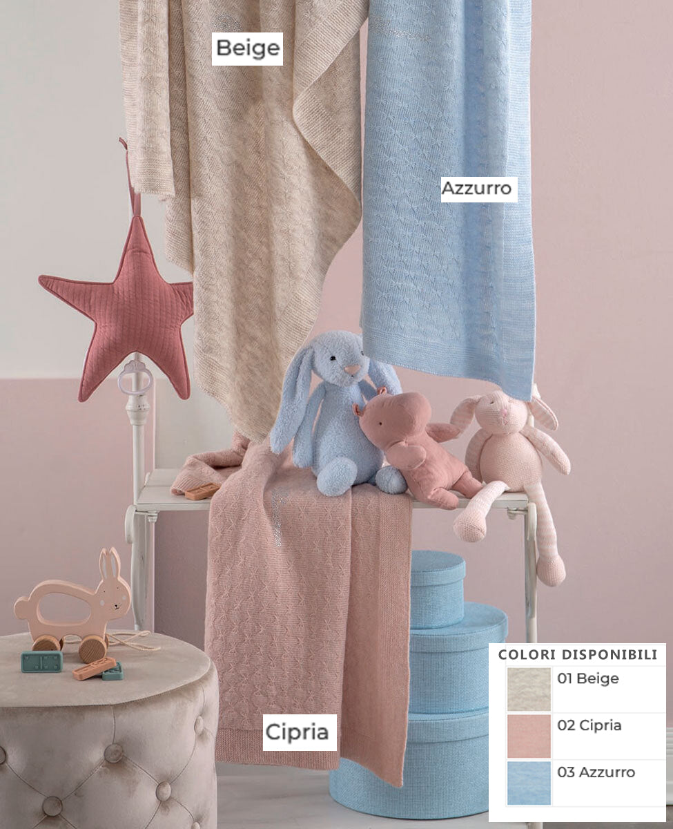 Copertina per culla e carrozzina con disegno in jacquard e logo Blumarine in cristalli.