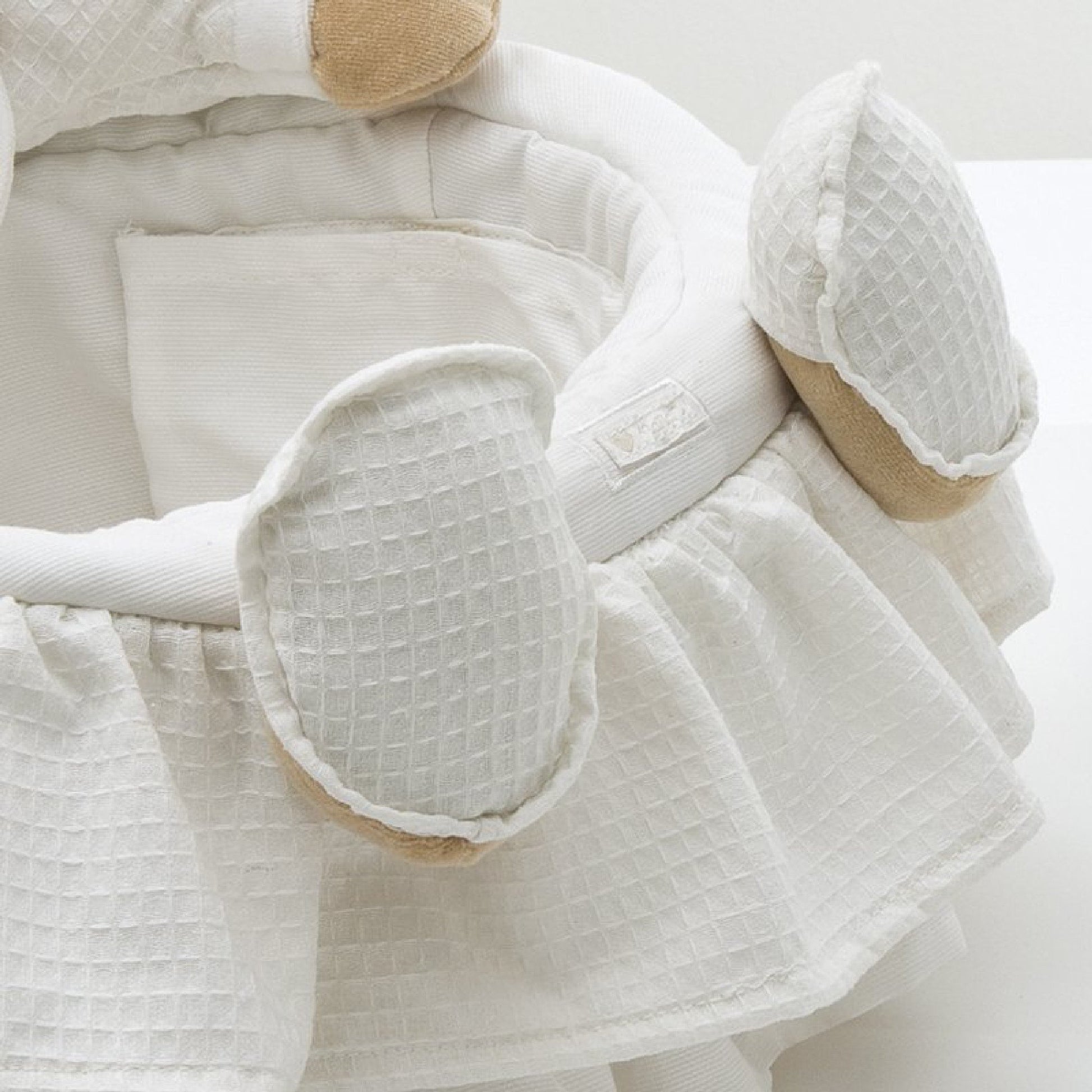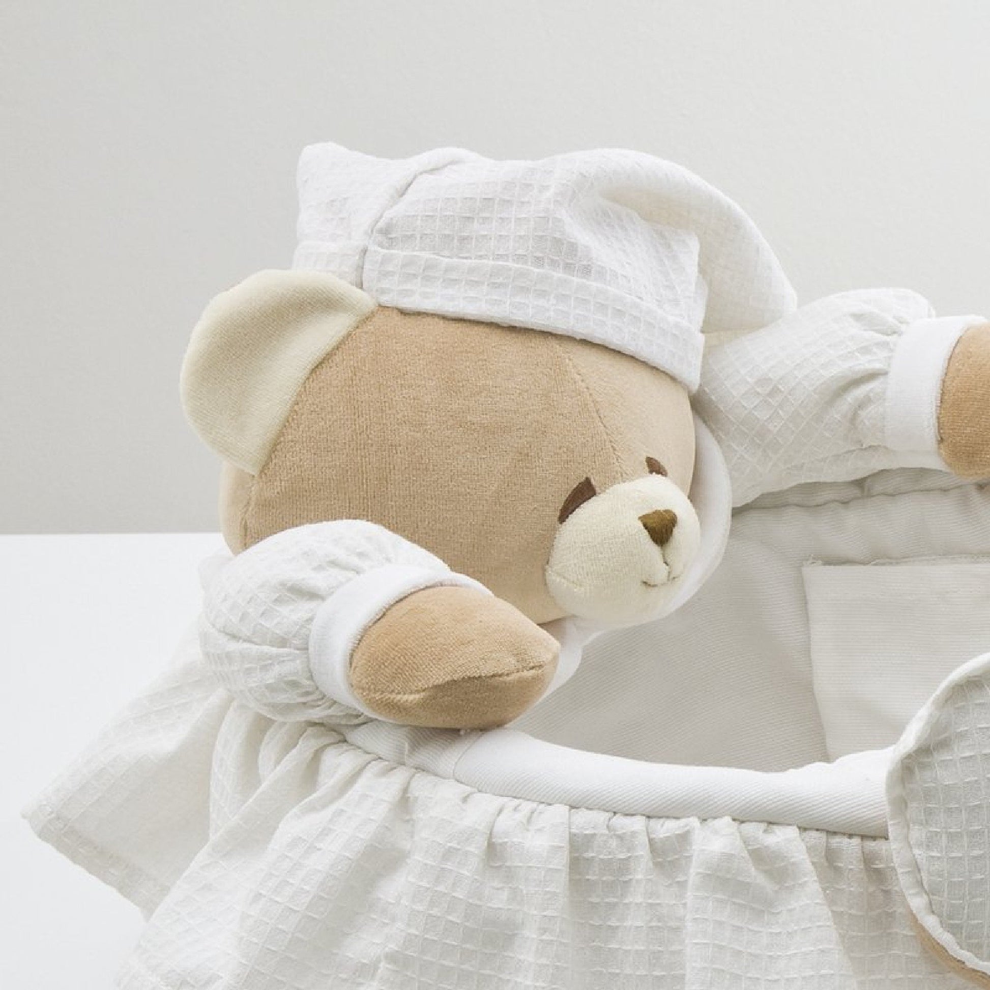 I cestini portaoggetti Nanàn della collezione Tato sono in vimini naturale intrecciato a mano, completamente ricoperti in tessuto piquet di puro cotone, impreziositi dall'applicazione in morbida ciniglia dell'orsetto Tato che abbraccia dolcemente i cestini.