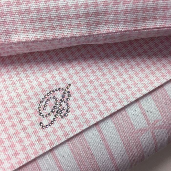 - Sacca cm. 70 x 85 con logo in cristalli sopra stampata a righe con parte superiore in pied de poule, il tutto stampato su piquet millerighe, logo in cristalli. Retro sacca in percalle tinta unita