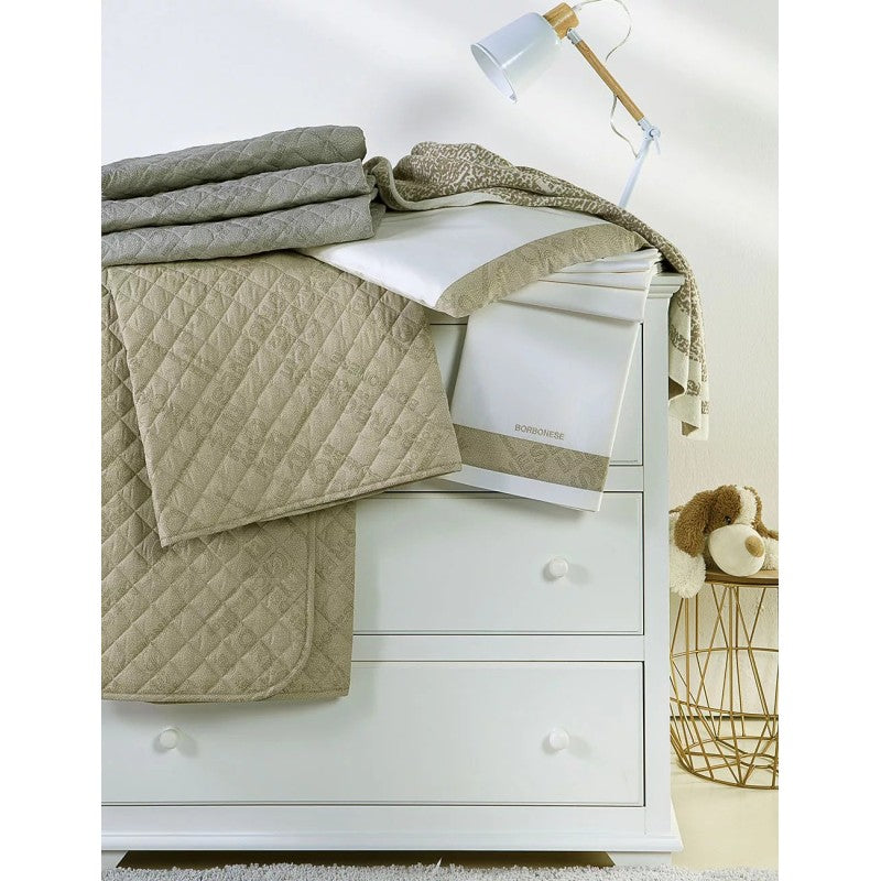 Completo lenzuola per lettino in percalle di puro cotone 200 T.C. tinta unita con profili stampati con iconico motivo “OP” Occhio di Pernice sul bordo del lenzuolo e della federa e logo Borbonese ricamato.