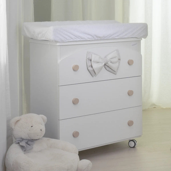 Il Fasciatoio Tondo 3 cassetti di Coccolissimi è praticissimo ma super elegante! Il design arrotondato del cassetto superiore e l'adorabile fiocco della collezione Stars strizzano l'occhio all'ottimizzazione degli spazi. In un solo prodotto, infatti, ti permetterà di avere non solo una cassettiera capiente per contenere biancheria, abbigliamento e tanto altro, ma anche un fasciatoio con vaschetta per bagnetto estraibile all'occorrenza.