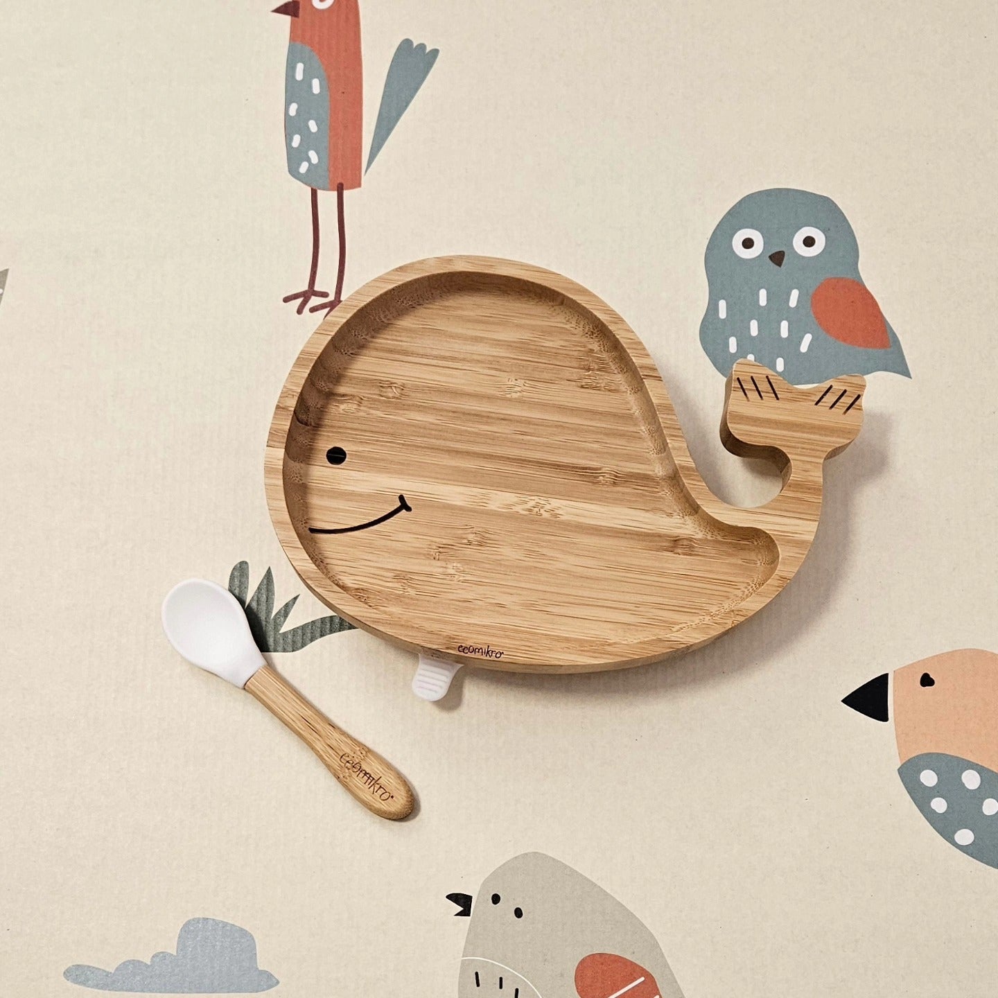 Il piatto balena in bambù di Ecomikro ha una ventosa rimovibile che garantisce l’aderenza al seggiolone o al tavolo.
