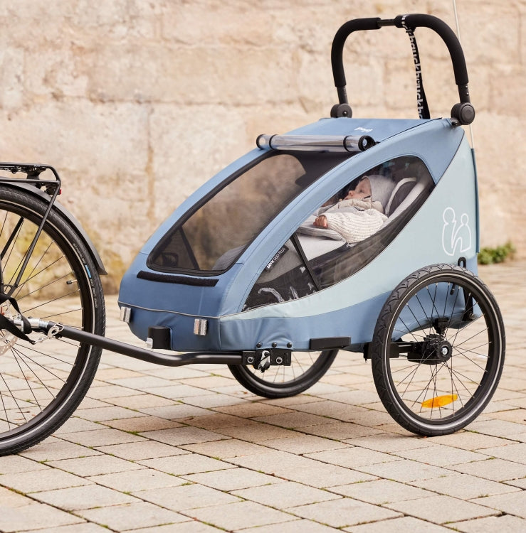 Siete spesso a spasso e hai bisogno di un rimorchio per bici che si trasformi facilmente in un passeggino? E che puoi rapidamente agganciare alla tua bicicletta? Allora Dryk Duo Plus è perfetto per te.