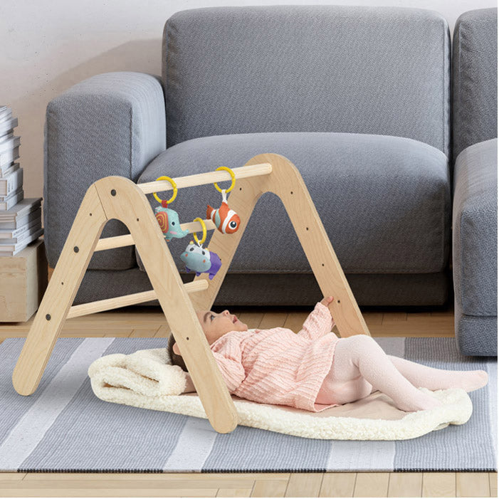 - La struttura a triangolo dotata di 3 robuste barre di legno permette di attaccare giocattoli (2 giochi inclusi) e tessuti al prodotto, creando molteplici possibilità di intrattenimento e offrendo innumerevoli stimoli