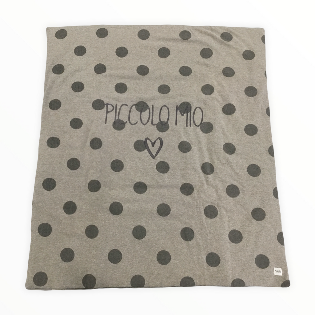 Copertina pois color tortora, ideale per i mesi piu freddi per tenere al caldo il bebe. Composta da morbidisimo jersey di cotone ed impreziosita dal dolce ricamo "Piccolo Mio".