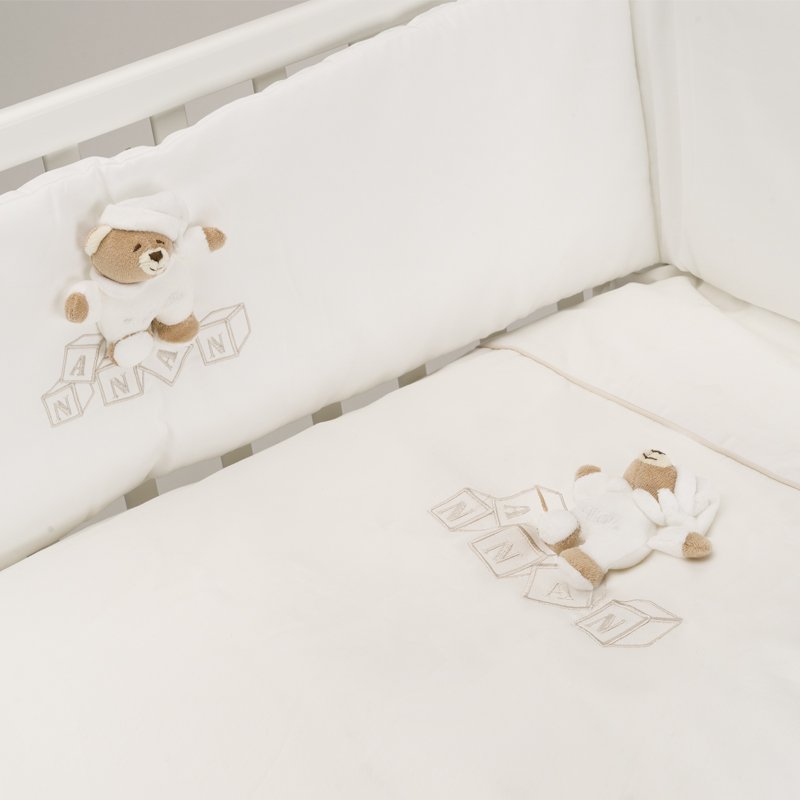 Il set piumone Nanàn della Collezione Dadini è formato da: federa per cuscino, paracolpi imbottito, piumone sfoderabile e quindi facile al lavaggio, con una composizione di puro cotone. Impreziosito dal ricamo centrale e dal dolce orsetto Tato, rende il lettino un luogo incantato, per far sentire protetto il bebè durante la nanna.