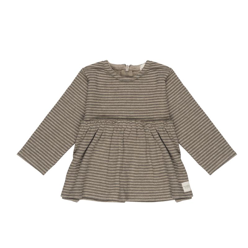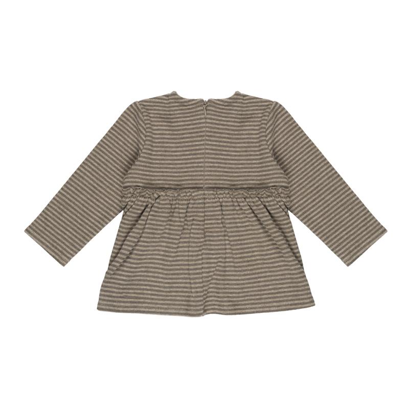 Graziosa blusa rigata tortora a maniche lunge. Impreziosita da una leggera arricciatura in vita, e comoda da indossare e perfetta per accompagnare la tua bimba nelle sue attivita quotidiane.