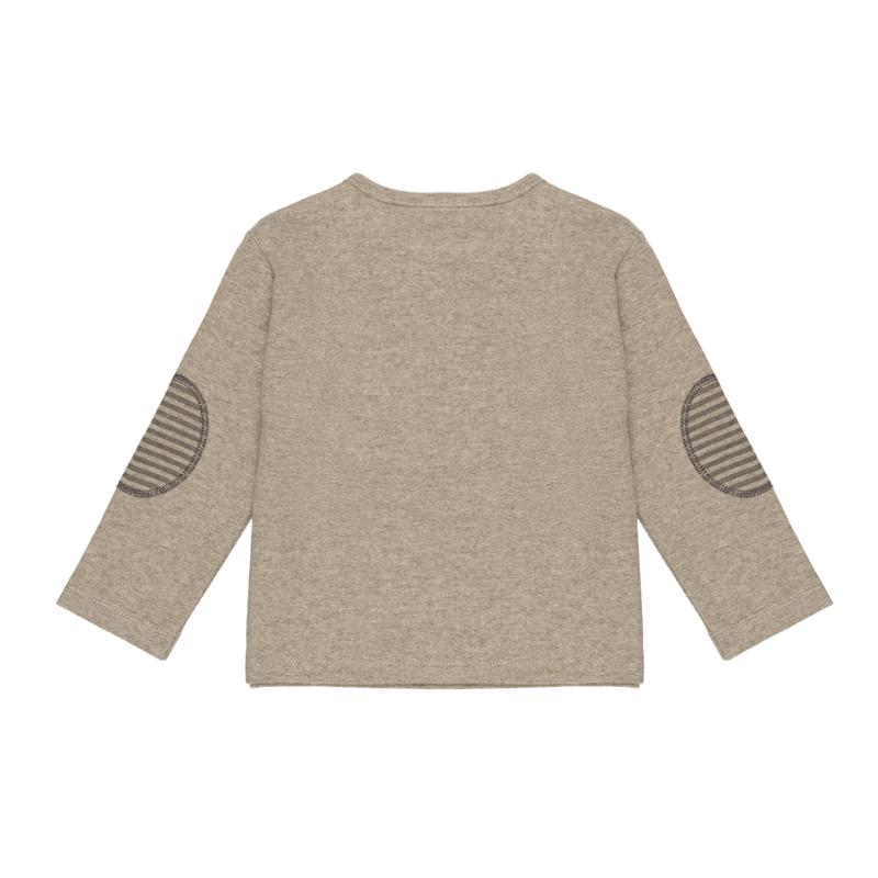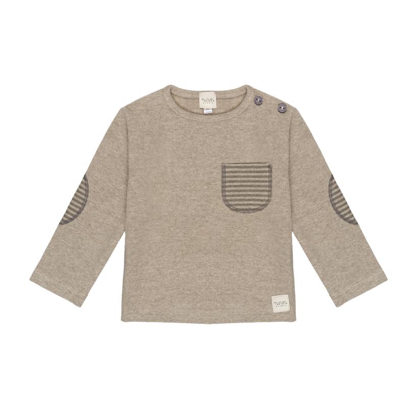 Maglia a maniche lunghe color tortora. Resa particolare dal taschino e dalle toppe rigate applicate sui gomiti.