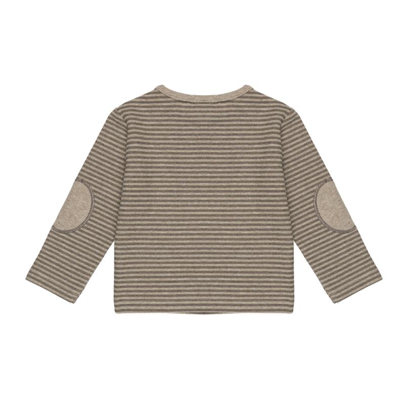 Maglia rigata a maniche lunghe color tortora. Resa particolare dal taschino e dalle toppe applicate sui gomiti.