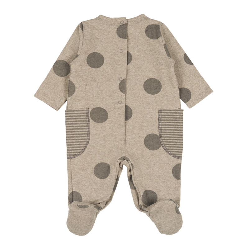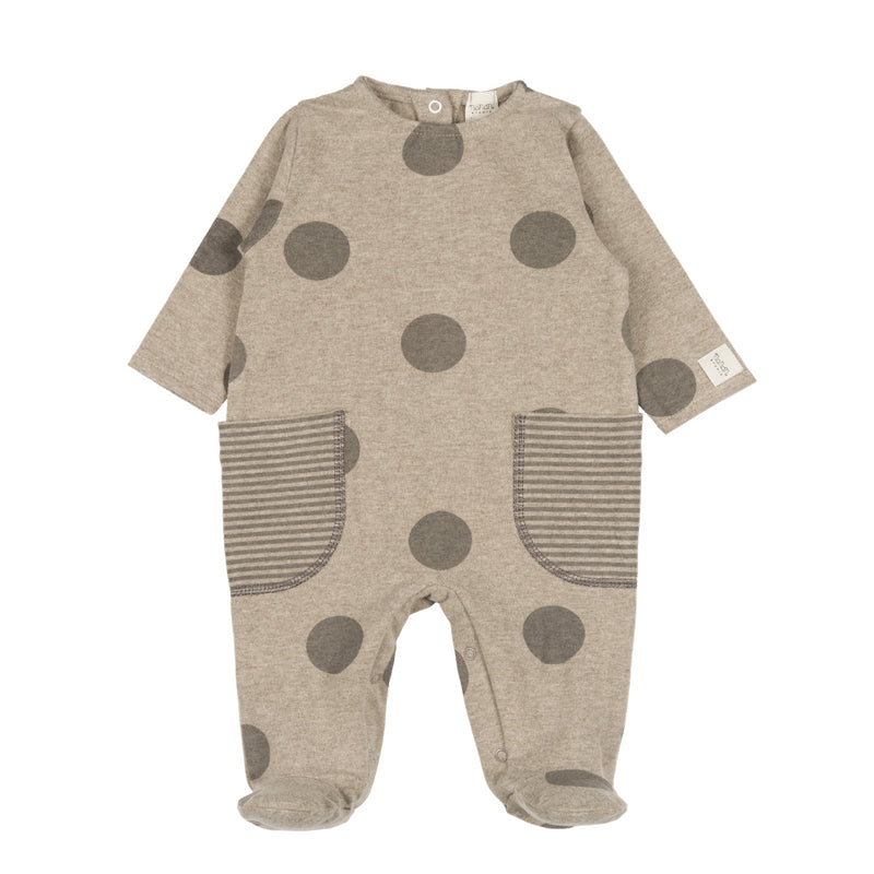Graziosa tutina a pois, realizzata sui toni del tortora. Questa tutina e resa particolare dal dettaglio rigato delle tasche, che la rendono sfiziosa e particolare, perfetta per la tua bimba!