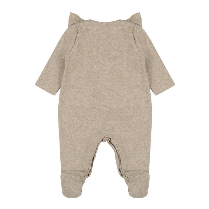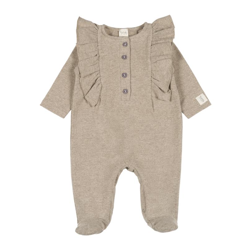 Graziosa tutina in cotone color tortora, impreziosita dalle adorabili ruches sulle spalle e dai dolci bottoncini frontali. Abbottonatura inferiore e posteriore.