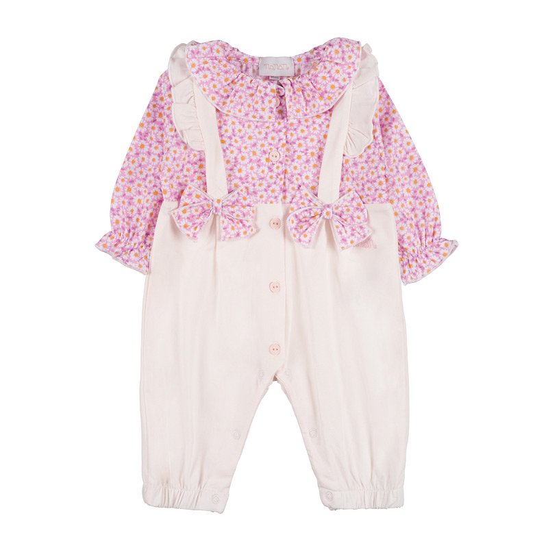 Graziosa tutina aperta davanti con dolci fiocchetti laterali. Impreziosita da una dolce camicia fiorata con frappa, che accompagnerà la tua bimba nelle sue giornate con infinita dolcezza!